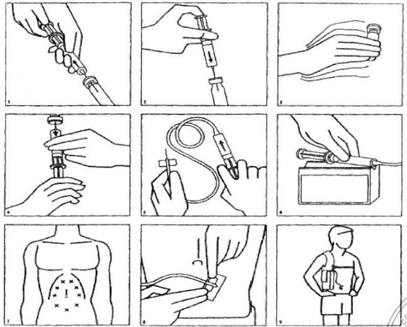 7. За инфузията можете да вкарате инжекционната игла тип „пеперуда" под кожата на корема, ръката, горната част от крака или бедрото. Кожата трябва първо да се почисти много добре със спирт преди вкарване на цялата игла в кожна гънка, която оформяте със свободната си ръка. Върхът на иглата трябва да се движи свободно при разклащане на иглата. Ако гой не се движи свободно, това означава, че с прекалено близо до кожата. Опитайте отново на друго място след почистването му със спирт.
