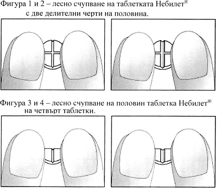 Ако лекарят Ви е предписал да приемате 1/4 (четвърт) или 1/2 (половин) таблетка дневно, моля, прочетете указанията по-долу как можете да счупите таблетката Небилет® с две делителни черти на кръст.