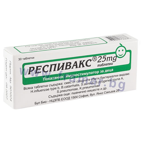 - Активно вещество - Всяка таблетка Респивакс® за деца съдържа 25 mg лиофилизирани убити бактериални култури: Streptococcus pneumoniae, Branhamella catarrhalis, Streptococcus pyogenes от група A, Haemophilus influenzae type b, Staphylococcus aureus, Klebsiella pneumoniae в количества, съответстващи на 0,625 χ 10 9 клетки от всеки вид.