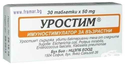 - Активно вещество: Всяка таблетка Уростим® за възрастни съдържа 50 mg лиофилизирани убити бактериални култури от: Escherichia coli 29, Escherichia coli J5 в количества съответстващи на 3 χ 109 клетки, и Proteus mirabilis, Enterococcus faecalis, Klebsiella pneumoniae в количества съответстващи на 0,4 χ 109 клетки от всеки вид.