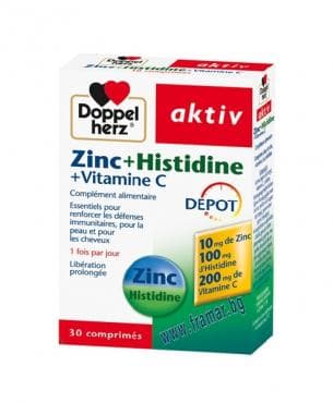 Цинкът допринася за нормалното делене на клетките и спомага за поддържане на доброто състояние на кожата. Тялото ни не може само да произвежда витамин С и цинк, както и незаменимата аминокиселина L-хистидин, затова те трябва редовно да бъдат набавяни чрез хранителни източници. Продуктът Допелхерц® актив Цинк + Хистидин + Витамин С е разработен под формата на специална ДЕПО таблетка. Благодарение на нея съставките се освобождават в продължение на много часове и остават налични за организма, когато са необходими.