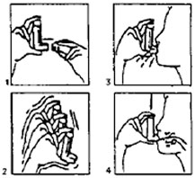 Д. Вдишайте през устата възможно най-дълбоко. Натиснете върха на флакона, както е показано на илюстрацията на фиг. 4, докато вдишвате;