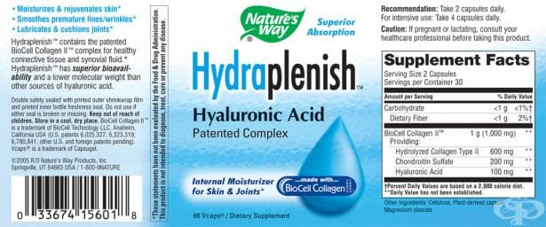 Hydraplenish® е натурален продукт с високо качество, който допринася за доброто състояние на кожата и подпомага нормалната функция на ставите и опорно-двигателния апарат. Формулата му включва патентования комплекс BioCellCollagen®, който е източник на природен колаген тип II, хиалуронова киселина и хондроитин сулфат с висока степен на усвояемост. Трите съставки се отличават с ниско молекулно тегло, което е предпоставка за тяхната оптимална абсорбция и висока бионаличност в организма.