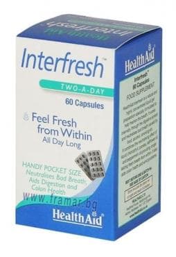 Капсулите Interfresh на HealthAid съдържат естествен, силно концентриран течен гел, специално създаден за освежаване на дъха. Работят в самата храносмилателна система. Ефективно неутрализират лошия дъх, причинен от консумация на чесън, лук, риба, пикантни храни и тютюнопушене. Могат да се използват и сутринта веднага след ставане.