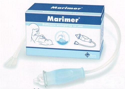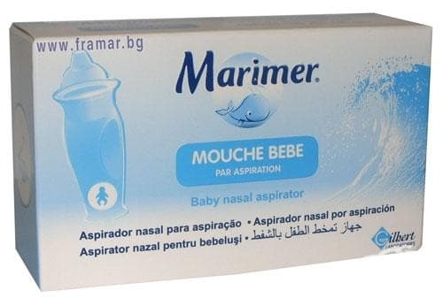 Бебешки аспиратор за нос MARIMER е идеалното решение за ефективното прочистване на бебешкия нос и следователно отпушва носа. Формата на накрайника и нежната текстура осигуряват максимален комфорт за вашето бебе. Филтърът на аспиратора е снабден с лента, която се сменя, без замърсяване на ръцете. Филтриращата технология MARIMER осигурява ефикасно прочистване, благодарение на високата всмукателна способност. Секретът се изсмуква без използване на сила и остава в резервоара без опасност да попадне обратно в носа на бебето. Съхранявайте бебешкия аспиратор за нос в оригиналната кутия. Преди всяка употреба, уверете се, че всеки компонент е в добро състояние. Сменете бебешкия аспиратор за нос и/или накрайник при най-малките признаци на износване или повреда. Не изварявайте. Посъветвайте се с Вашия фармацевт при нужда.