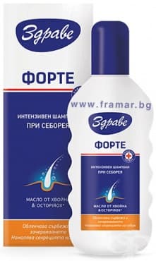 Шампоанът Здраве форте при себорея е интензивен продукт, създаден за случаите на тежък пърхот и себорея, придружени от сърбеж и зачервяване на кожата на главата. Той съдържа две взаимодопълващи и засилващи своята активност съставки – масло от Хвойна и октопирокс.