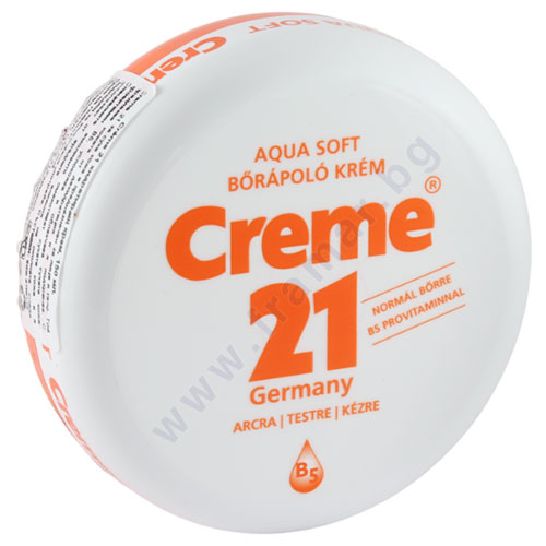 Creme 21 за суха кожа е предназначен за лице и тяло. Той предпазва кожата от дехидратация и я подхранва. С провитамин B5 успокоява сухата кожата. Специалните емолиенти омекотяват и предпазват от вредните влияния на околната среда. Подходящ за ежедневна употреба.