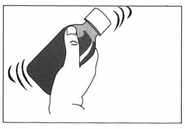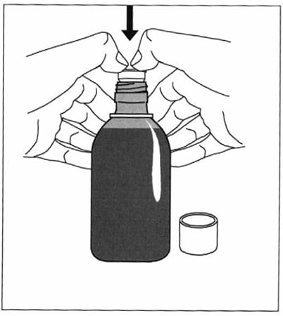 1. Разклатете бутилката с лекарството в продължение на поне 10 секунди. 2. Отстранете предпазната капачка за деца като силно натиснете надолу и я завъртите в посока обратно на часовниковата стрелка (както е показано на капачката). Забележка: Запазете капачката невредима, за да затваряте бутилката след всяка употреба. |