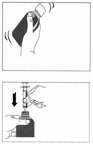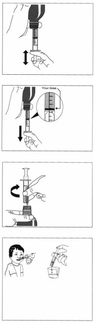 Лекарството може да бъде поето направо от дозиращата спринцовка или да бъде смесено в малка чаша с вода. 1. Разклатете добре бутилката. Веднага след това пригответе дозата. 2. Натиснете и завъртите предпазната капачка за деца, за да отворите бутилката. (Забележка: Винаги поставяйте обратно капачката след употреба) 3. Уверете се, че буталото е напълно избутано в цилиндъра на пероралната спринцовка. 4. Задръжте бутилката изправена и пъхнете здраво пероралната спринцовка в пластмасовия адаптор. |