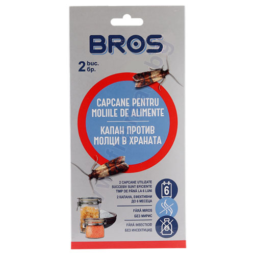 BROS Капан против молци в храната. Лепкав лист без мирис за наблюдение на наличието на молци по храната в помещения като кухни, килери или складови помещения, както и директно в шкафове с хранителни продукти. Работи само по физически начин - възрастните молци се залепят на тези капани, което позволява ранно откриване на тези насекоми в помещението и оценка на техния брой. Един лист остава ефективен до 3 месеца. Не съдържа химически инсектициди, така че може да се използва в непосредствена близост до хранителни продукти като брашно, грис, макаронени изделия, зърнени храни, кафе, чай, какао, сушени плодове. Може да се залепи на всяко място или да се окачи с помощта на отвора в капана. Наблюдението на молците, залепени за капана, позволява да се вземе решение дали да се използва подходящ биоциден продукт Bros, за да се контролират. Наличието дори на един възрастен молец по храната в капана е индикация за прилагането на такъв продукт. Капанът не е биоциден продукт.