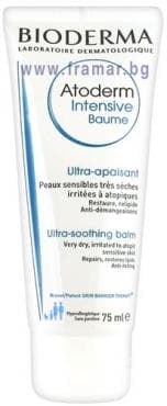 Силната и рецидивираща сухота се характеризира със силен сърбеж, хронични възпаления, изменена кожна бариера и размножаването на бактерията Златист стафилокок, съвкупно отговорна за вторични инфекции. Иновация на BIODERMA, Atoderm Intensive Baume е първата едновременно успокояваща и намаляваща сърбежа грижа, която третира биологичните дисфункции на много сухата, раздразнена до атопична чувствителна кожа. Atoderm Intensive Baume бързо спира сърбежа и намалява желанието за чесане, благодарение на своята дерматологично активна съставка PEA. Обогатена с успокояващи и почистващи агенти, тя веднага успокоява раздразненията. Atoderm Intensive Baume трайно възстановява кожната бариера благодарение на изключителния патент Lipigenium*, съставен от био-липиди, естествено налични в епидермиса. Те по идеален начин се интегрират в кожата, създавайки естествен защитен филм още с първото нанасяне. По биологичен път стимулират синтеза на липиди и протеини (филагрин), които свързват извънклетъчния матрикс и възстановяват кожната бариера. Патентованият комплекс Skin Barrier Therapy* позволява от една страна да се ограничи слепването и размножаването на Златистия стафилокок, а от друга страна предотвратява проникването на алергени - двата основни фактора, които влошават сухотата. Кожата е пречистена, успокоена и възстановена. Последно поколение ултра богата и нелепкава текстура.