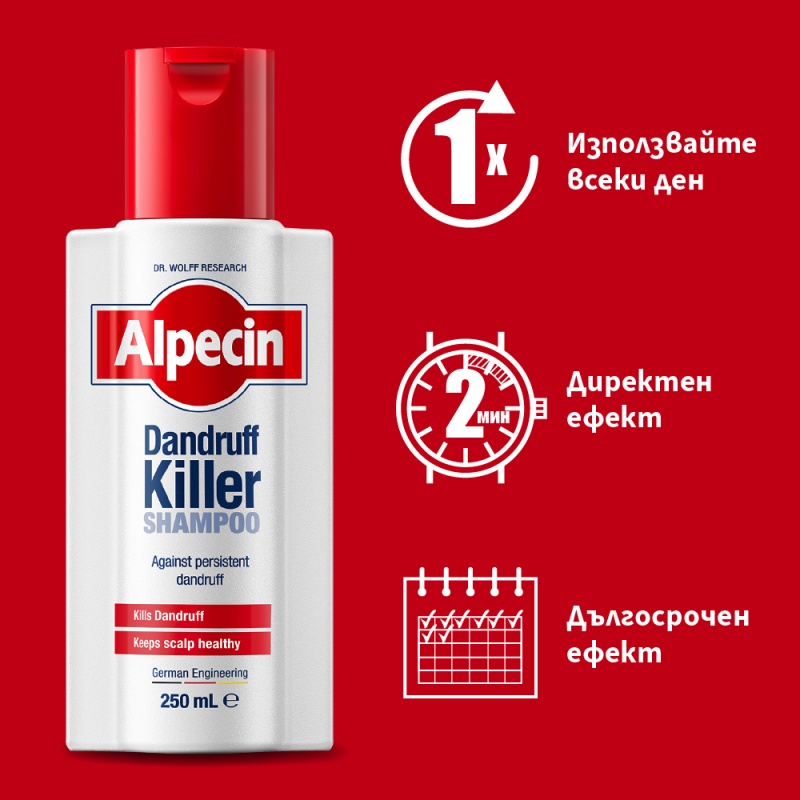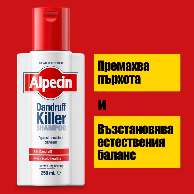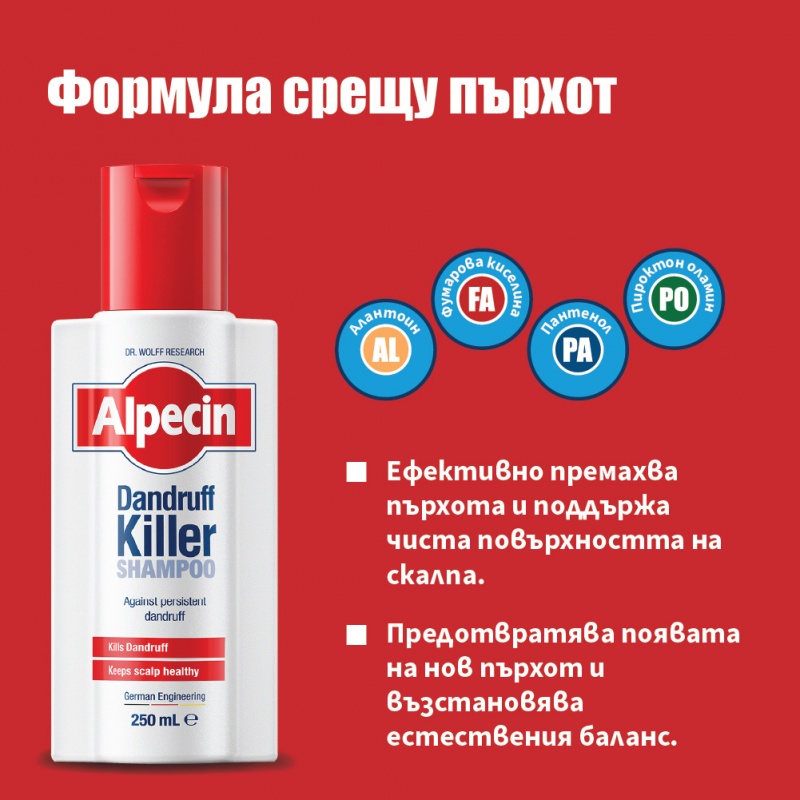 Alpecin Shampoo Dandruff Killer съдържа четири съставки, които работят в синергия, за да премахнат съществуващия пърхот. Успокоява раздразнения скалп, премахва пърхота и осигурява защита срещу повторната му поява. Съставен от прецизно балансирана комбинация от йони, алантоин и пантенол, продуктът допринася за облекчаване на сърбежа по скалпа.