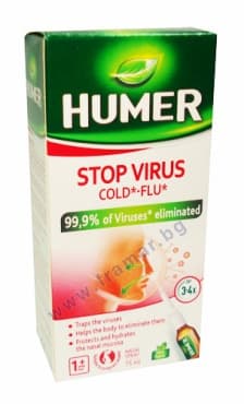HUMER СТОП ВИРУС е спрей за нос, предназначен за спиране на вирусите и предпазване от настинка и грип. Продава се в стъклена бутилка от 15 ml с ръчен спрей.