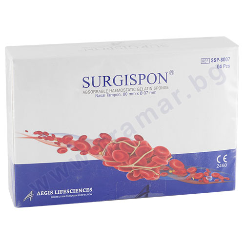 SURGISPON е непирогенна и био съвместима хирургична хемостатична гъба, произведена от високо пречистен първокласен желатинов материал за употреба при хирургични процедури. Имплантира invivo, в подходящи количества, тя се резорбира напълно в рамките на 3 – 4 седмици. Приложена към кървящи лигавични зони, тя се втечнява в рамките на 2 до 5 дни.