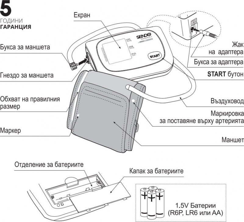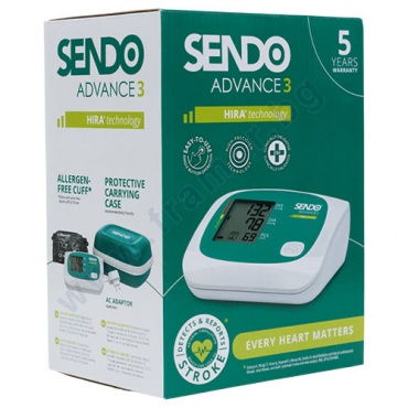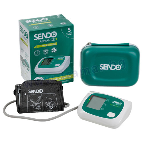 SENDO ADVANCE 3 има 5 години гаранция и идва в специална кутия за съхранение, изработена от защитна пяна и облицована с екокожа. Предлага се с опция за маншет в два размера M (22-32 см) или L (31-45 см), изработен от хипоалергенни материали. Апаратът има индикатор за грешно поставен маншет, който намалява човешката грешка при измерването на кръвното налягане до минимум. Можете да го използвате както с батериите в комплекта, така и с адаптера, включен в електрическата мрежа.