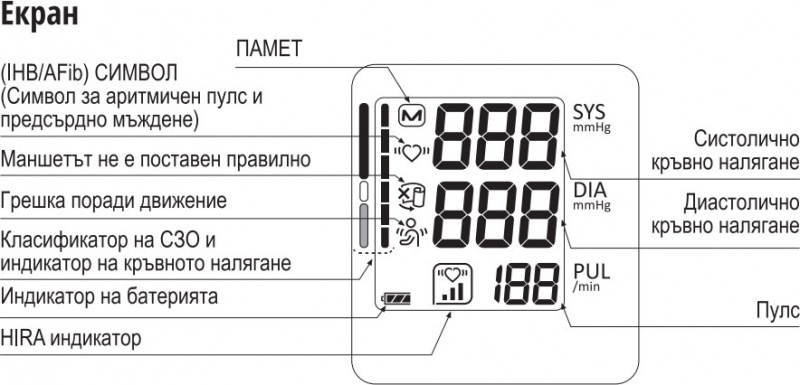 | Обхват на измерването | Налягане: 0 – 299 mmHg. Систолично налягане: 60 – 279 mmHg. Диастолично налягане: 40 – 200 mmHg. Пулс: 40 – 180 удара/ минута. |