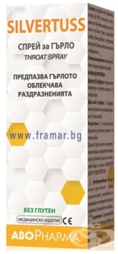 Спреят за гърло SILVERTUSS в медицинско изделие, предназначено да облекчава дразненето в гърлото, свързано с болка, парене и затруднения при преглъщане. Наличието на екстракт от Лечебна мъдрица подпомага възстановяваното на гласа, докато екстрактът от Бяла ружа, богат на клей, предпазва устната лигавица от дразненията на външни агенти. Етеричните масла от лимон и евкалипт, имат освежаващ ефект, докато сухият екстракт от Прополис и колоидно сребро предпазват разтвора от противодействието на външни микробни агресии.