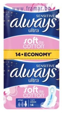 Дамските превръзки Always ultra night sensitive са супер тънки и достатъчно дълги и абсорбиращи за максимално удобство, комфорт и защита през ноща или през периодите на обилно кръвотечение през месечния цикъл. Крилцата осигуряват допълнителна защита от протичане и се закрепват сигурно към бельото. Меката като памук материя прави превръзките подходящи и за най-чувствителната кожа.