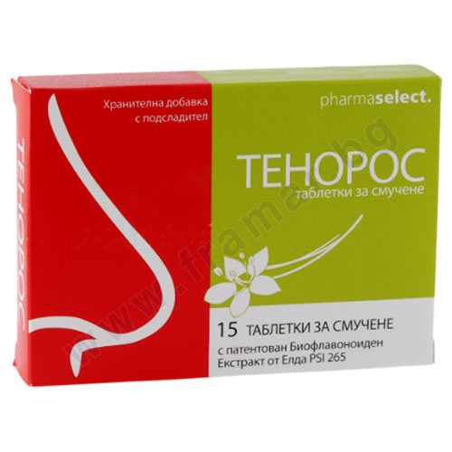 ТЕНОРОС съдържа силно концентриран екстракт от елда PSI 265 и се предлага под формата на таблетки за смучене. Включените в тях биофлавоноиди благоприятстват устойчивостта на кръвоносните съдове и защитните сили на организма. По време на зимния сезон организмът има нужда от по-голямо количество от тези вещества, но те се приемат в по-малки количества с обичайната храна.