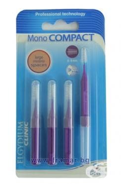 Интерденталните четки за зъби Elgydium Mono Compact ефективно премахват плаката и остатъците от храна. Те са ергономични и гъвкави. Имат ултра фини влакна (0,38 - 0,6 мм), достигащи и до най-труднодостъпните места. Всяка четка е със защитна капачка. Почистват се с антисептична вода за уста или само с чиста вода.