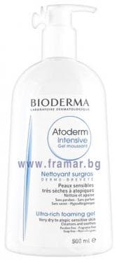 Atoderm Intensive Gel moussant (измиващ гел) нежно почиства, облекчава усещането за дискомфорт и успокоява сърбежа на много сухата и раздразнена кожа. Витамин РР подсилва и спомага заздравяването на кожната бариера. Силно обогатената измиваща основа без сапун, физиологични рН и липсата на аромат запазват баланса на кожата. Патентът Skin Barrier Therapy™ предпазва кожата от замърсявания. Отлична толерантност. Некомедогенен. Без парабени.