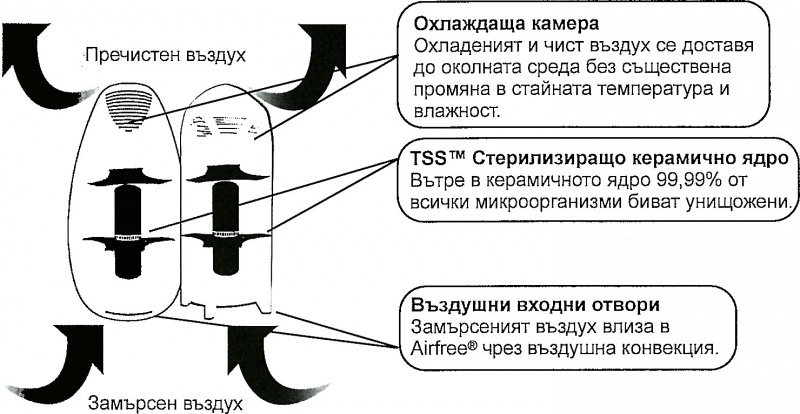 Независимо колко опасни могат да бъдат вирус, гъбичка или бактерия, те биват напълно унищожени от мощната топлина вътре в мини каналите на TSS™ керамичното ядро. Топлината вътре в керамичното ядро ускорява стерилизирания въздух нагоре към топлообменника, пораждайки въздушна конвекция, което генерира отрицателно налягане под керамичното ядро, и така замърсеният въздух бива “всмукван” през въздушните входни отвори на дъното на Airfree® под формата на постоянен, безшумен и ефективен въздушен поток.