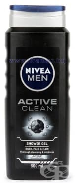 Nivea Men Active Clean 3 в 1 душ гел за тяло, лице и коса за дълбоко почистване и ревитализиращо усещане. 99% биоразградима формула (според OECD или други еквивалентни методи). Бутилка направена от 97% рециклирана пластмаса, с изключение на етикета и капачката.