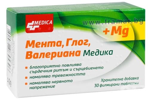 Мента, Глог, Валериана + Mg е продукт на растителна основа, обогатен с Магнезий, който оказва благоприятно влияние върху сърдечносъдовата система и сърдечния ритъм, допринася за намаляване на нервното напрежение, чувството на безпокойство и раздразнителност.