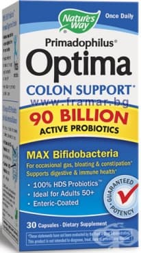 Продуктът представлява високо ефективен синбиотик, специално разработен в подкрепа на дебелото черво и принадлежи към т. нар. HDS пробиотици, съдържащи пробиотични щамове, изолирани от естествената чревна микрофлора на човека. За разлика от обикновените пробиотици, HDS пробиотиците остават неувредени от суровата стомашна киселина, за да стигнат непокътнати до червата – там, където има най-голяма необходимост от тях. Всяка капсула съдържа 90 милиарда активни бактерии. Този продукт се препоръчва за хора над 50-годишна възраст, при които има недостиг на бифидобактерии. С годините количеството бифидобактерии в колона значително намалява, това води до различни стомашно-чревни проблеми като болест на Крон, раздразнено дебело черво, улцеративен колит и други. Примадофилус Оптима Colon Support е изключително ефективен в случаите на нарушена флора след антибиотично лечение и има силно имуностимулиращо действие.