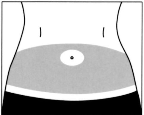 Област 1: Стомашна област (корем) около пъпа. Избягвайте 5 см около пъпа.