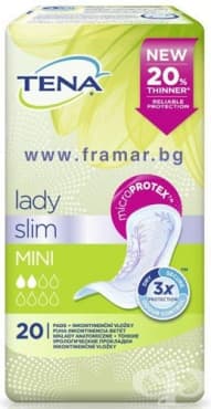 TENA Lady Slim Mini са с 20% по-тънки урологични подложки. Предпазват от миризма, протичане и усещане за мокрота, благодарение на специалната DRY Зона. Големината им е колкото малка дамска превръзка. Проектирани са да защитават при лека слабост на пикочния мехур. Дори при натиск TENA Lady Slim Mini остават напълно сухи, благодарение на DRY Зоната, която осигурява дискретна защита на мига. За невероятен комфорт, сухота и сигурност.
