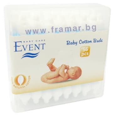 Event бебешки клечки за уши с хартиена дръжка и ограничител, произведени от 100% памук. Специално проектирания ограничител осигурява внимателно и безопасно почистване на очите, ушите, носа и пъпа на бебето.