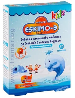 Eskimo-3 kids - дъвчащи желатинови таблетки са хранителна добавка - богата на Omega-3 мастни киселини, с високо съдържание на EPA (54 mg на таблетка), както и на DHA (270 mg на таблетка).