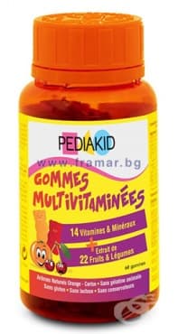 PEDIAKID® Gommes Multivitaminees са идеално пригодени за деца над 3-годишна възраст. Комбинират 14 витамина и минерала, както и патентован екстракт от 22 плодове и зеленчуци (Oxxynea®), които допринасят за приема на основни микронутриенти. Богати са на витамини А, С, Е, К, В1, В2, В3, В5, В6, В8, В9, В12, селен и цинк. Подпомагат правилната функция на имунната система (витамин С, цинк, селен), психологичната и нервна системи (витамини B1, B2, B9 и др.) и спомагат за намаляване на умората (витамини C, B3, B5 и др.). Не съдържат желатин, консерванти, глутен, лактоза, изкуствени оцветители или аромати.