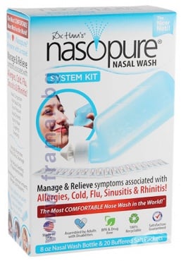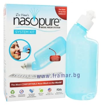 Назален душ Nasopure се използва за промивки на носа при хрема, алергии, настинки, синузит, ринит, или за превенция от разболявания.