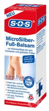 SOS Микро сребърния лосион е за специална интензивна грижа при суха кожа на краката. Лосионът помага на кожата да се възстанови и да намери естествения си баланс. Балсамът спомага за балансиране на влагата в кожата, поддържа обновяването на клетките и облекчава неприятния сърбеж. Съдържа MicroSilber (микро сребро). Уреята и глицерина спомагат за дълготрайно запазване на влагата в кожата, а пантенол стимулира естествения процес за подновяване на кожата. SOS Micro Silber лосиона за крака е дерматологично тестван. Не съдържа оцветители и нано сребро и е подходящ за диабетици.