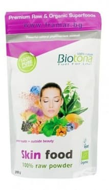 Biotona bio Skin food е синергичен микс от 16 висококачествени суперхрани, включително гел от алое вера, коприва, зърнастец и куркума, всички от които помагат за поддържане на кожата млада и здрава. Оризовият протеин на прах е отличен източник на растителен протеин, осигуряващ широк спектър от аминокиселини, които могат да бъдат вградени в колагеновите влакна. Ацерола (западноиндийска череша) е естествено богата на витамин С, който поддържа нормалното образуване на колаген и поддържането на здрава кожа. Праховете от готу кола и коприва осигуряват добрата циркулация на кръвта през кожата. Миксът съдържа и полезни прахове, извлечени от къдраво зеле, семена от нар, червено цвекло, шипки, домати и листата на дървото моринга, което е известно още като дървото-чудо! Храната Biotona Skin е пълна с чиста матча, спирулина и боровинки, които ще придадат на външния ви вид свеж и жизнен вид. Всички тези компоненти са 100% органично култивирани и преработени на прах по начин, който оптимално запазва всички естествено налични хранителни вещества и фитонутриенти!