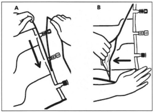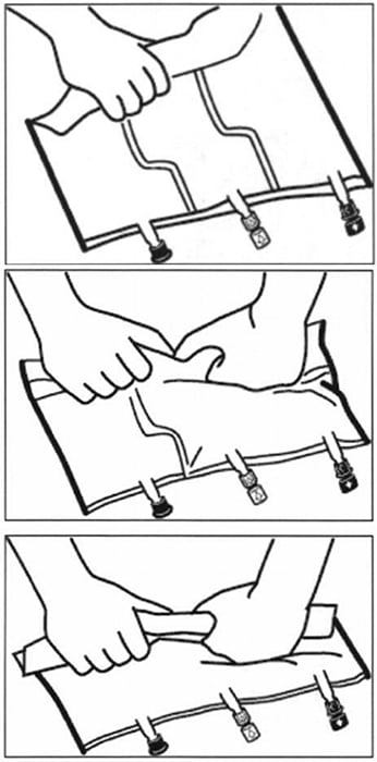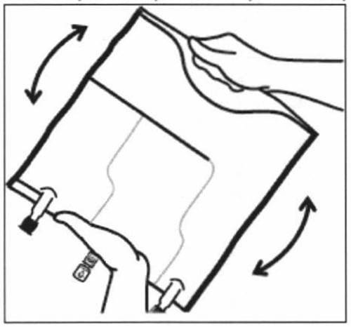 Започнете стегнато да навивате сака от страната на дръжката по посока на порталите, като започнете с дясната ръка и продължите с прилагане на постоянен натиск с лявата ръка докато се разкъсат вертикалните прегради. Вертикалните прегради се отварят поради налягането на течността. Разкъсващите се прегради могат да бъдат отворени и преди отстраняването на външната опаковка.