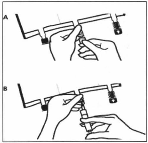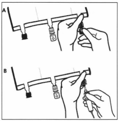 Придържайте основата на смесителния портал. Въведете иглата и инжектирайте добавките (с позната съвместимост) през средата на мястото за инжектиране (В).