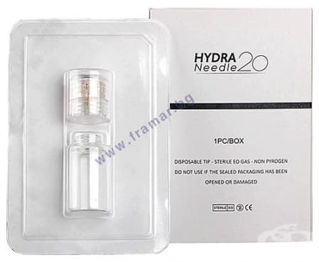 Хидра Игла 20 е уред с микро-игли за нанасяне на козметични продукти в дермата за подобряване състоянието на кожата. Със своите 20 микро-игли (D = 130 um, L = 250 um / L = 600 um), c леки и нежни убождания, се образуват фини отвори в кожата без болка. През специалната спирална система, проектирана на микро-иглите, разтворът навлиза в кожата директно и много ефективно, което помага на разтвора да постигне перфектния си ефект вътре в кожата. Може да ползвате Хидра Иглата и върху кожата около очите, както и върху скалпа.