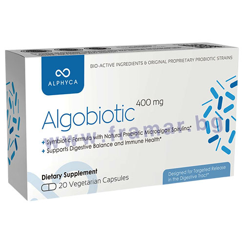 Algobiotic на Alphyca® е иновативна симбиотинна формула от 8 оригинални български щама пробиотични бактерии и подхранваща биоактивна съставка - микроводорасли Спирулина.