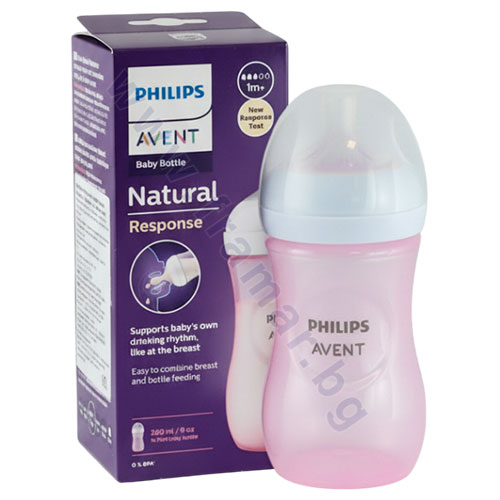 1 брой розово шише Philips Avent, 260 мл, Natural Response 3.0 с биберон /1+ месеца/, розово.