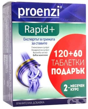 Проензи® Рапид + съдържа комбинация от субстанции за поддържане здравето на ставите - глюкозамин сулфат, хондроитин сулфат, босвелия и специалния ExPur complex, състоящ се от неденатуриран колаген тип II и витамин С.