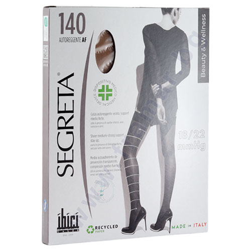 Стягащите чорапи Segreta са със средно силна компресия (от 18 до 22 mmHg) и hPa 24/29. Благодарение на фината силиконова лента под формата на дантела с ширина 6 см, прилепват плътно по крака. Имат чиста текстура тип "пчелна пита", анатомична пета и подсилен анатомичен пръст. Създават точната степен на компресия, която постепенно намалява нагоре по крака. Пристягат удобно областта на глезените. Облекчават умората в краката, възпрепятстват появата на отоци и нежно стимулират кръвообращението. Благодарение на тяхната специфична еластичност, осигуряват продължителен микромасаж. Това премахва опасността от кръвозадържане в глезените. Уплътняват добре пръстите на краката.