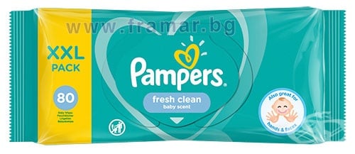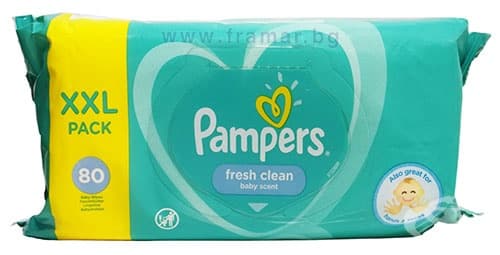 Мокрите кърпи Памперс Фреш Клийн почистват, овлажняват и освежават бебешката кожа. Създадени са специално за нуждите на най-малките. Те са клинично и дерматологично тествани. Независимо дали на детската площадка, столчето за хранене или на масата за повиване, почистват нежно и ефективно кожата на бебето. Могат да се използват както при смяна на пелените, така и за лице и ръце.