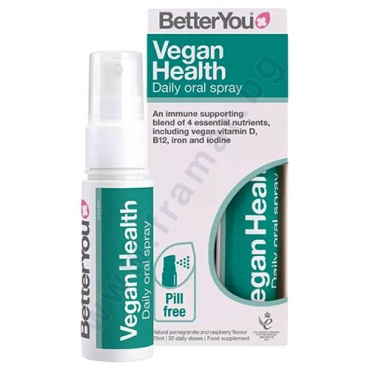 BetterYou Vegan Health Spray представлява научно разработена комбинация от нутриенти, създадена специално в подкрепа на хората, следващи вегански начин на живот. В състава му са включени ключови елементи като вегански витамин D3, витамин B12, йод и желязо. Този продукт осигурява бързо и качествено усвояване на хранителни вещества, които често не достигат в менюто на вегетарианците и веганите.