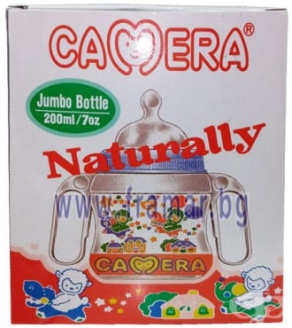 CAMERA предлага бебешка чаша с широк мек биберон против колики от естествен силикон, който се доближава максимално до формата на майчината гръд. Рационалната бутилка е с широко гърло. Има две дръжки. Създадена е, за да улесни прехода от сучене към самостоятелен прием на течности. Помага за промяна навиците на бебето. Подходяща е за пшеничен прах, ориз на прах и други хранителни вещества. Изработена е от поликарбонат, доставен от Bayer AG, Германия, устойчив на топлина. Почиства се изключително лесно.