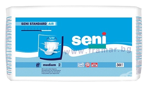 Seni Standard Air е надеждна защита, предназначена както за активни хора, така и за такива с ограничена мобилност. Универсалните пелени Seni Standard Air са подходящи за хора със средно и тежко ниво на инконтиненция. Seni Standard Air имат странични крила от нетъкан дишащ материал.