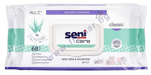 Seni Care Classik кърпички, обогатени с екстракт от алое и алантоин за овлажняващ и омекотяващ ефект. Препоръчано за ежедневно почистване, както и при обездвижени хора или с инконтиненция.