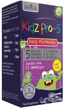 Пробиотикът за деца на Natures Aid Kidz Pro-5 съдържа 5 милиарда живи "добри бактерии" от 8 много добре проучени щама: Bifidobacterium lactis, Lactobacillus plantarum, Lactobacillus rhamnosus, Streptococcus thermophilus, Lactobacillus casei, Lactobacillus acidophilus sensu stricto, Bifidobacterium infantis, Lactobacillus reuteri. Подходящ е за вегетарианци и вегани. Предлага се под формата на бързо разтворим прахообразен продукт, лесен за прием от малки деца.